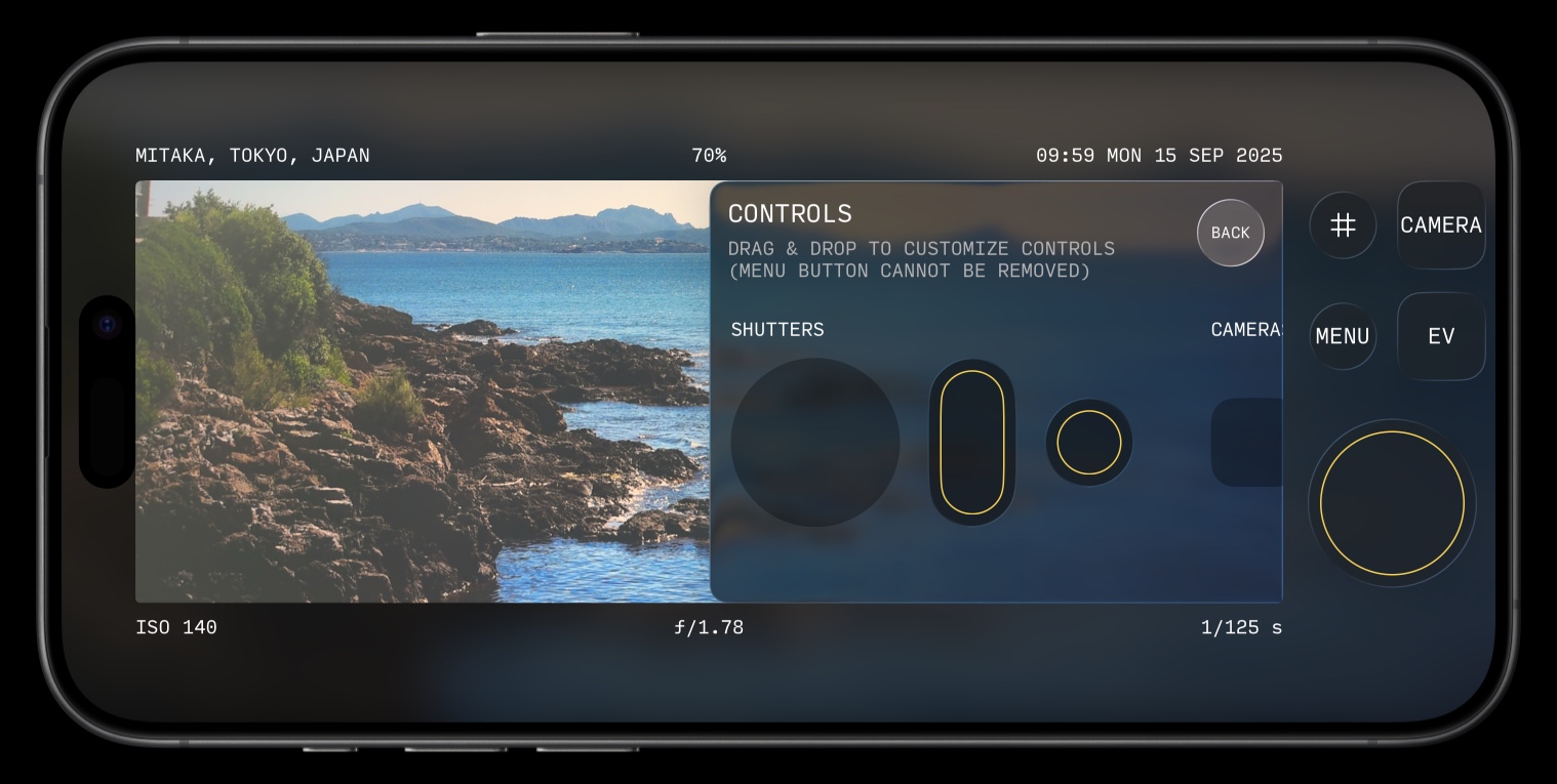 Keep in mind that the Down Volume button will also take a picture (as well as Camera Control on iPhone 16/17), so if you want to use 65×24 without a software shutter button, you can!