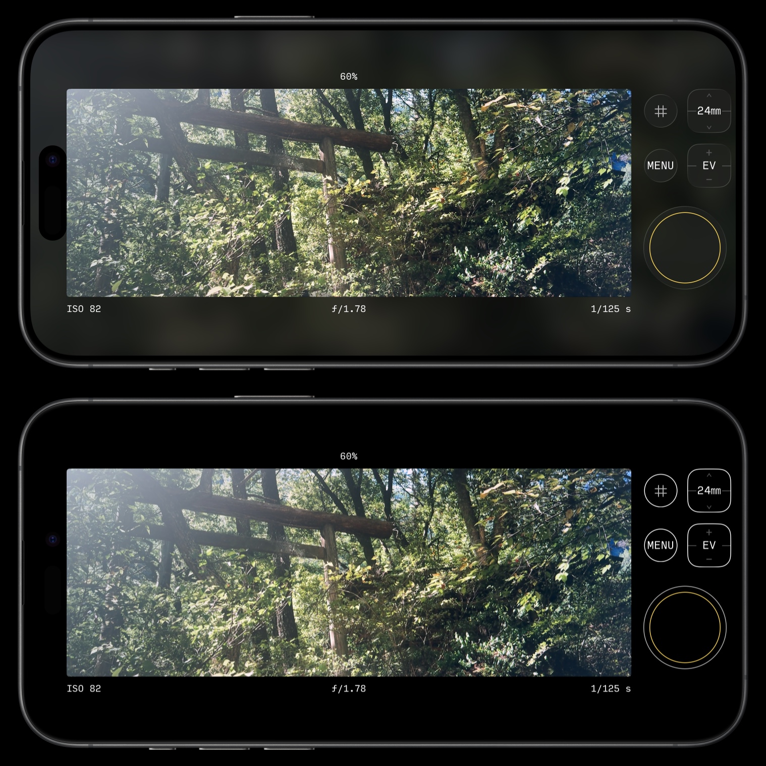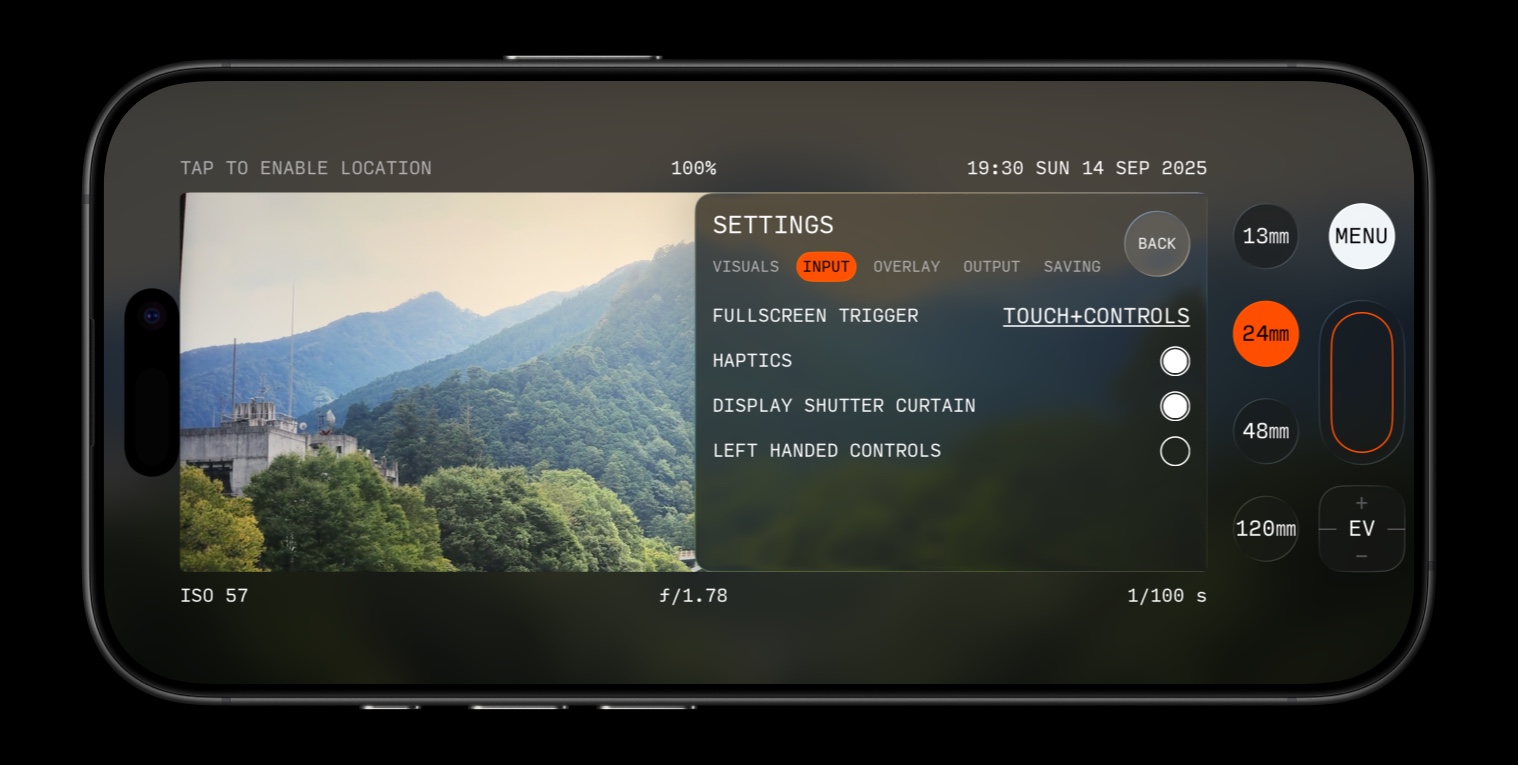 FULLSCREEN TRIGGER | 65×24 features an immersive, fullscreen viewfinder mode. When set to NONE, this mode never gets toggled. When set to CONTROLS, this mode gets toggled only when hardware controls (Volume buttons, Camera Control on iPhone models that feature it) are used. When set to TOUCH+CONTROLS, this mode gets toggled when hardare controls are used, or when the black area outside of the viewfinder is tapped. |