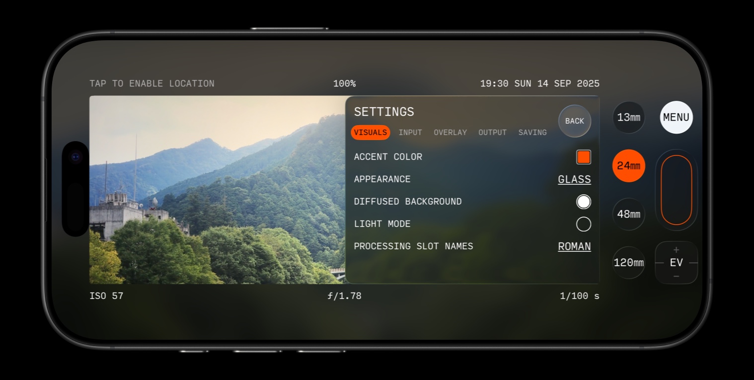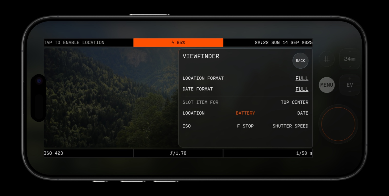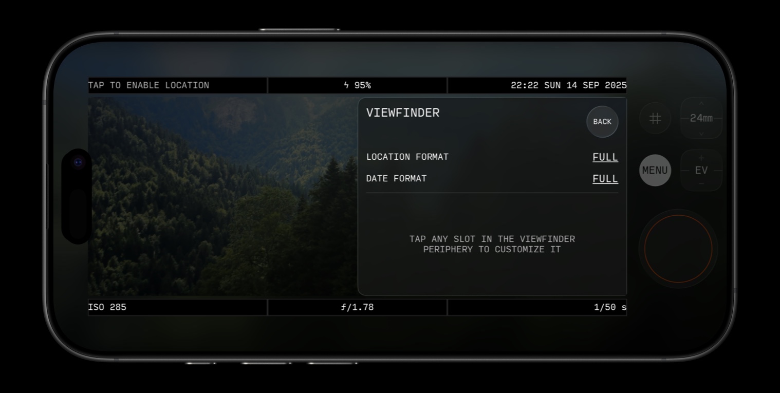 On the periphery of the VIEWFINDER, a number of information items are displayed. When you first launch the app, you will see location, battery charge status, date and time above the viewfinder; below, shutter speed, f-stop, and ISO for the active scene.